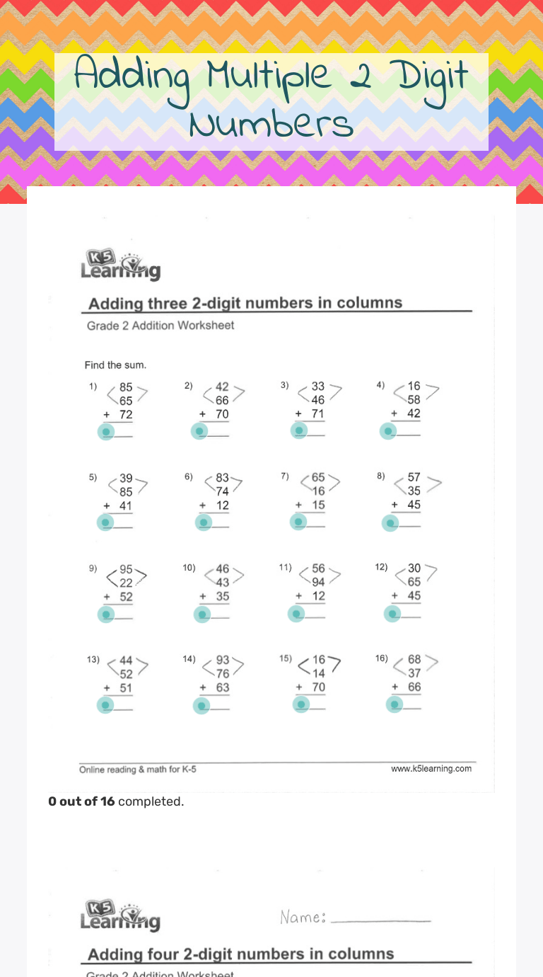 The best source for free addition worksheets. Our free second grade worksheet on multiple digit numbers helps students learn how to carry the numbers and be more proficient in math. 2.nbt.5 fluently add and subtract within 100. In worksheet on addition, all grade students can practice the questions on adding numbers with more than four digits. 1oa2 adding multiple addends (3 addends less than 20) (horizontal) ☆.